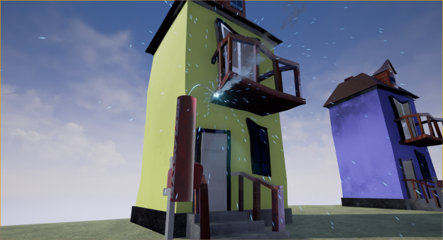 While this does not look like much I’m kind of proud of it because it’s my first foray into destructive meshes and animation. Obviously there is still a ton of work to do on this. The dynamite is way too overpowered, the hand animation has something weird going on with its fingers and the destroyed houses look awful but it’s a step in the right direction.
